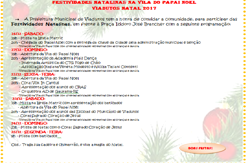 Na noite do último sábado (16), iniciamos as Festividades Natalinas em nossa cidade. Na ocasião estiveram presentes o Prefeito Municipal Claiton Dos Santos Brum, Vice-Prefeito Giovan André Sperotto,...