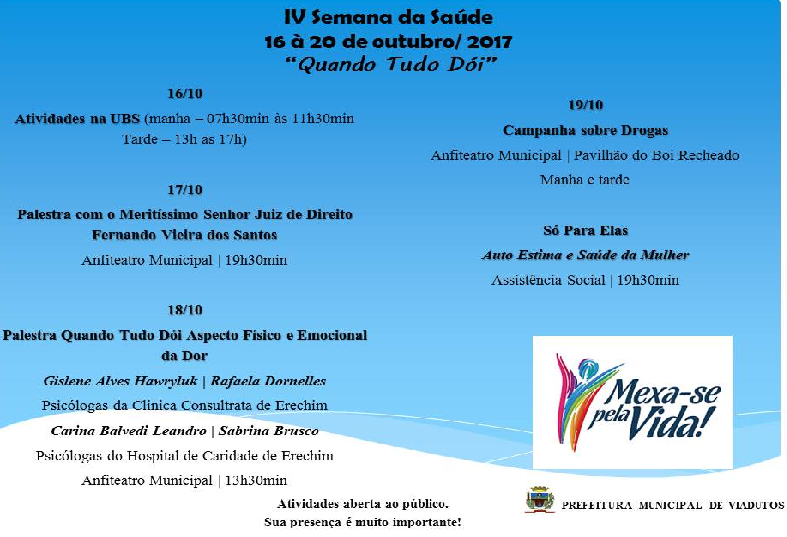 E com imensa satisfação e orgulho que encerramos a IV Semana da Saúde. Durante toda a semana foram abordados temas de suma importância para a população Viadutense.